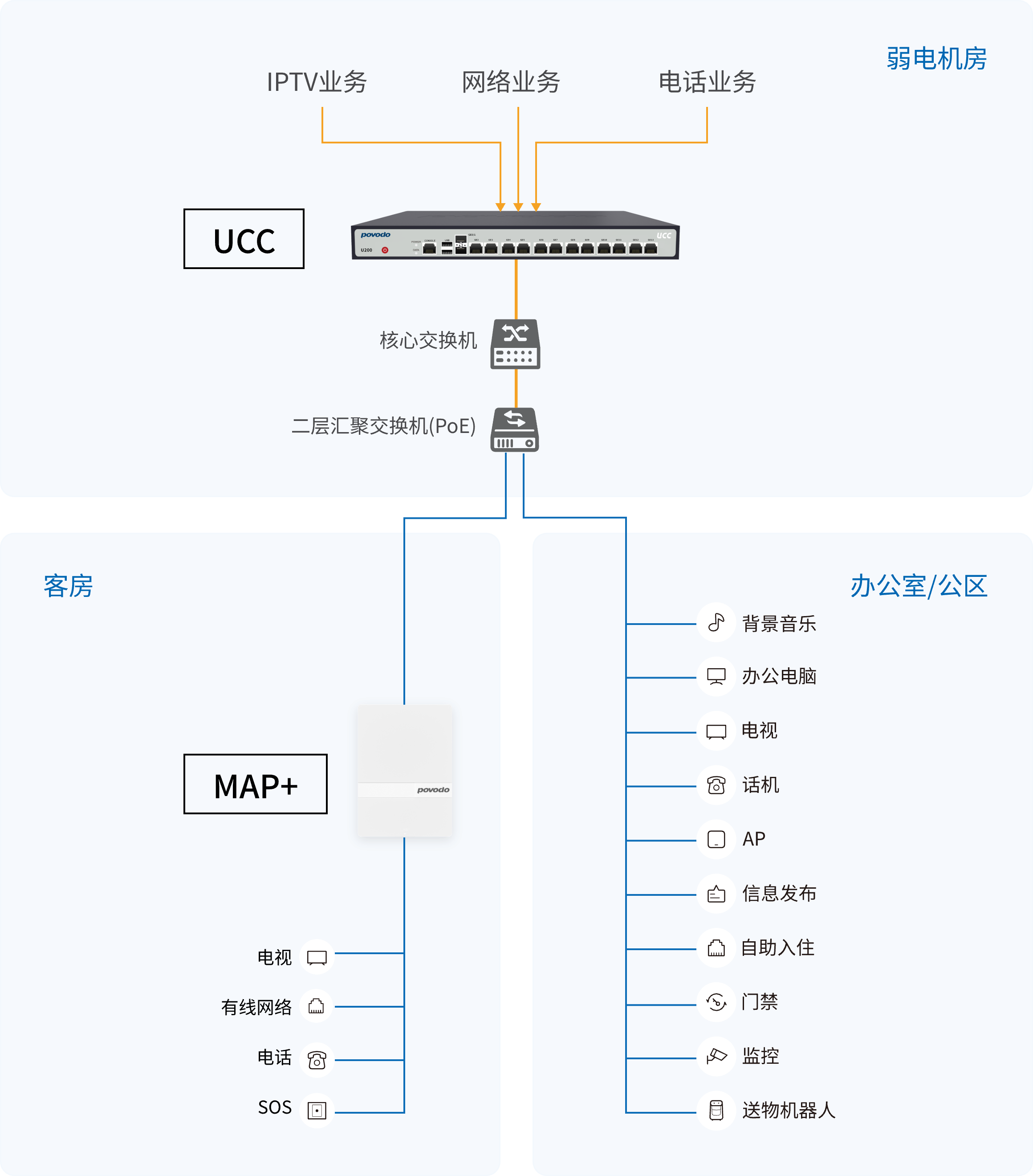 一个房间只需一根网线接入一个终端设备即可实现客房所有通信业务。